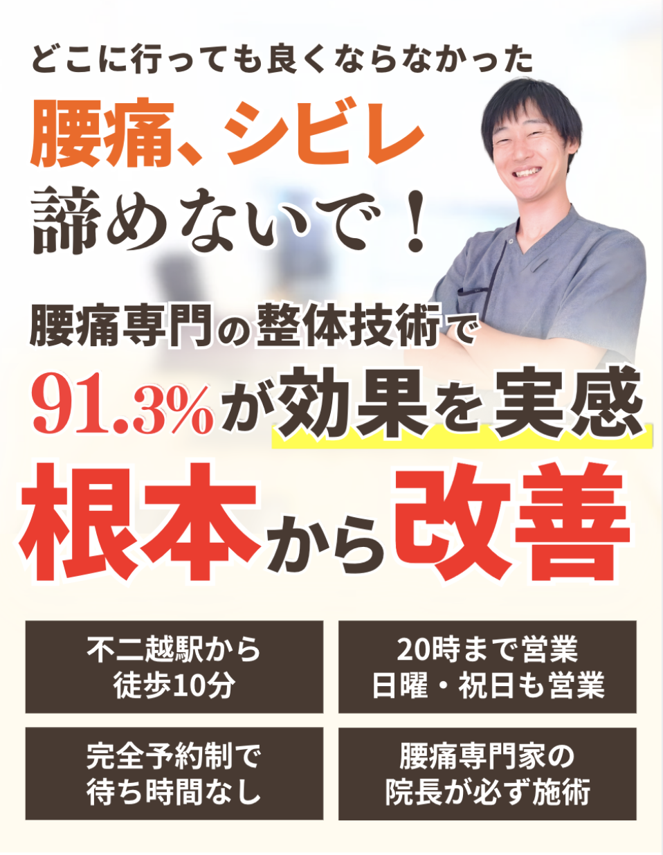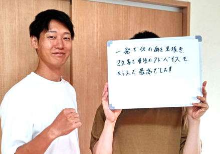 5年前から左腰痛と左膝痛に悩まされていた所、妻がチラシを見せながら家の近くに整体院があると進められ、半信半疑で通院しました。