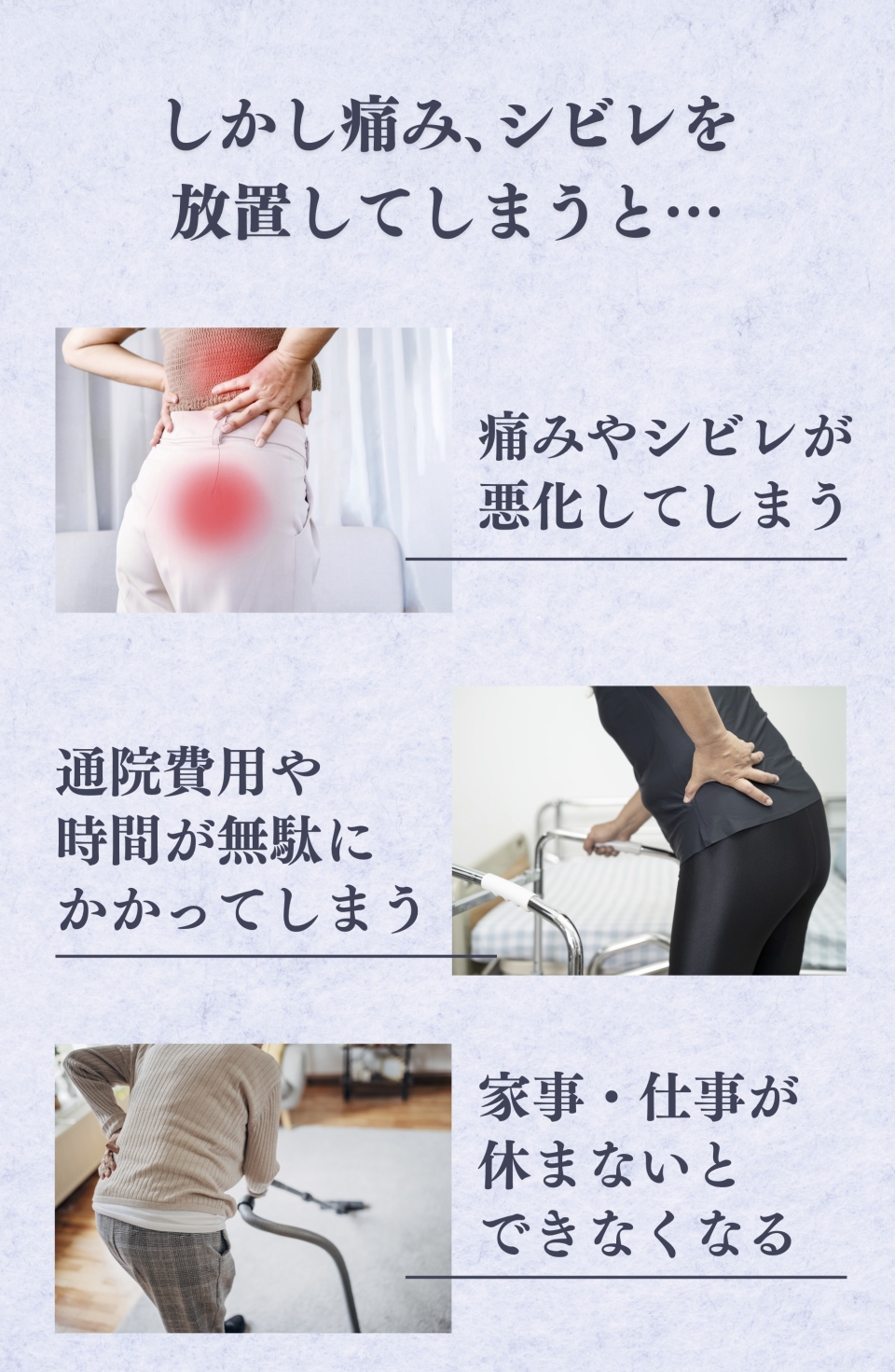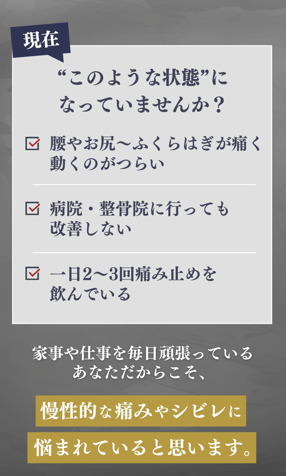 しかし、これらはいわゆる「対処療法」にすぎず、一時的に痛みを和らげるだけで、腰痛の根本的な改善にはつながりません。