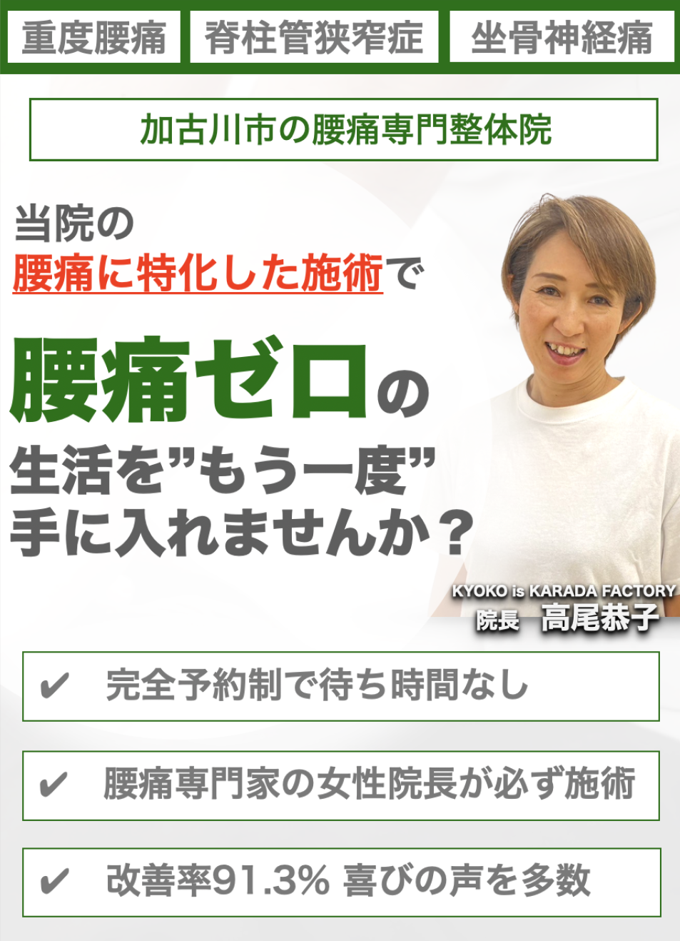 私は誰よりもあなたと向き合います。あなたの悩みを私に聞かせてください。あなたの慢性腰痛を改善するために全力で施術いたします。本気で慢性腰痛を改善したいと思われる方はいますぐお電話ください。