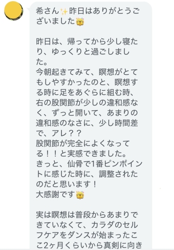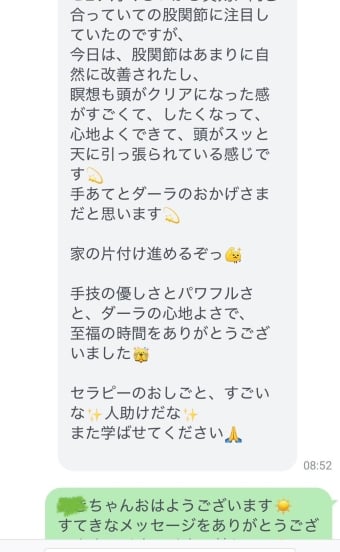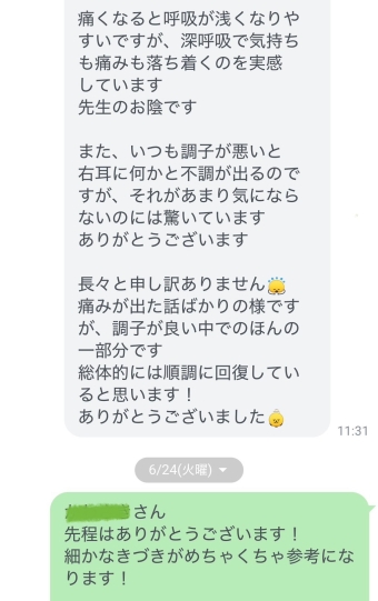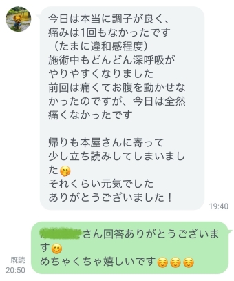 施術中もどんどん深呼吸がやりやすくなりました。前回は痛くてお腹を動かせなかったのですが、今日は全然痛くなかったです。