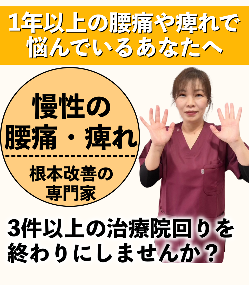 私は誰よりもあなたと向き合います。あなたの悩みを私に聞かせてください。あなたの慢性腰痛を改善するために全力で施術いたします。本気で慢性腰痛を改善したいと思われる方はいますぐお電話ください。