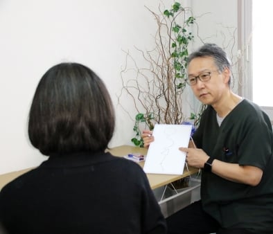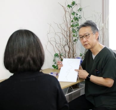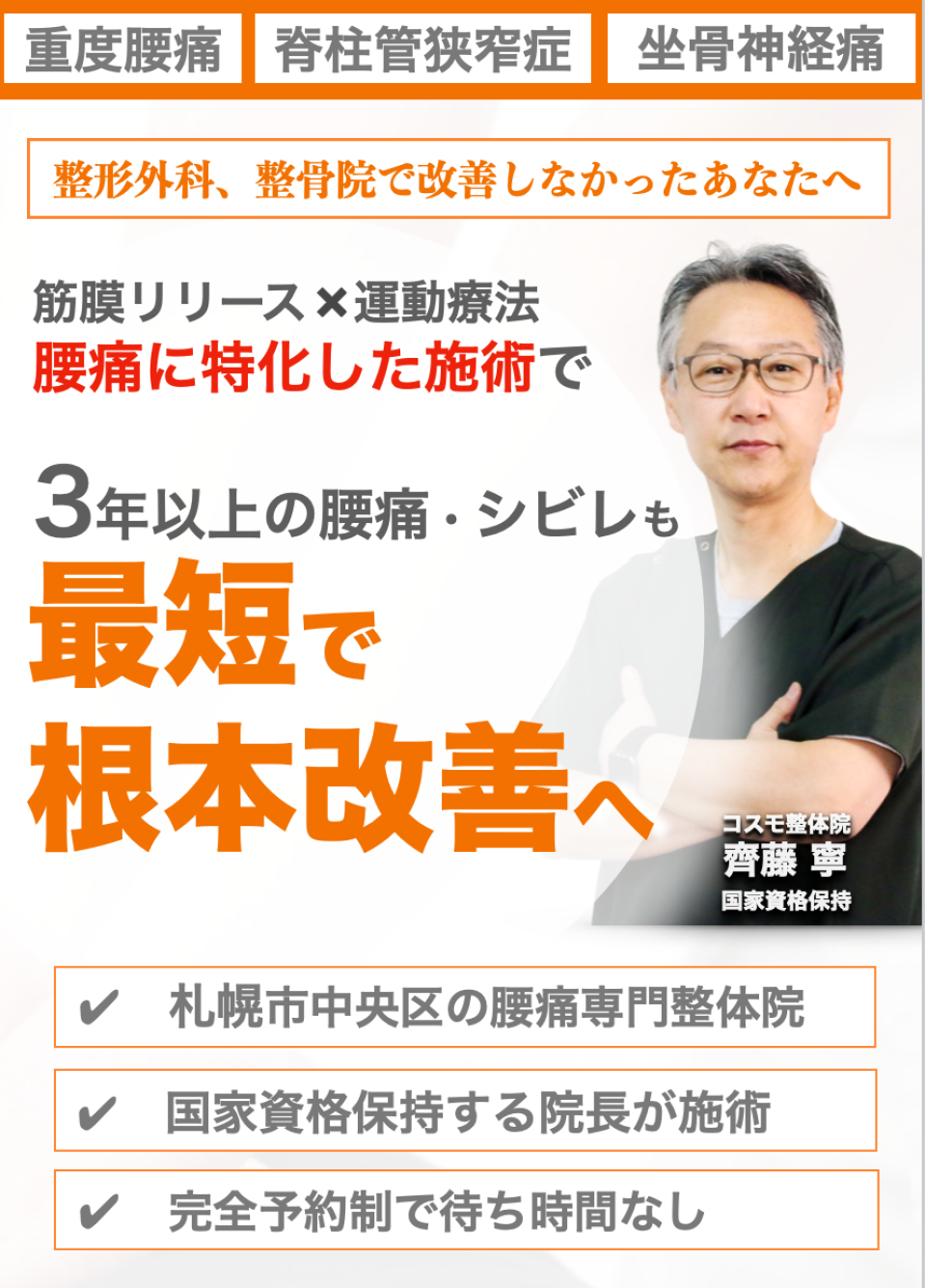 病院では脊椎管狭窄症と診断されましたが、薬のアレルギーがあるので痛み止めも飲めず、湿布も貼ることが出来ないので困っていた時にコスモ整体院さんのチラシをみて連絡しました。