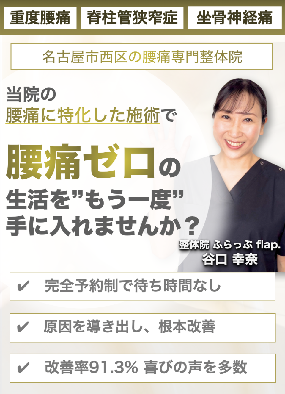 あなたの症状に真正面から向き合ってくれる名古屋市西区で唯一の慢性腰痛専門 「整体院 ふらっぷ flap. 」に来院し、もう二度とその慢性腰痛を我慢することのない人生を手に入れる道。
