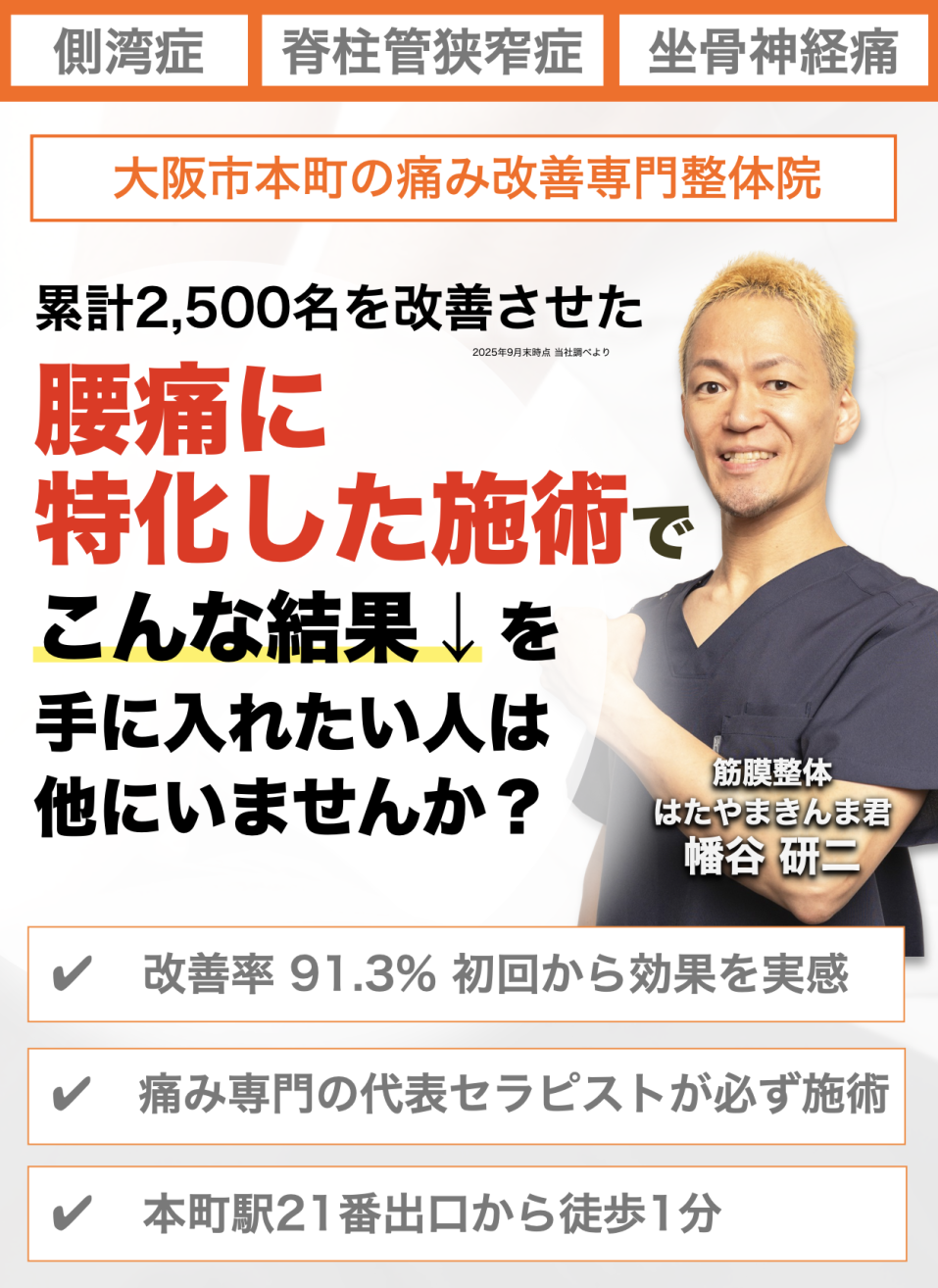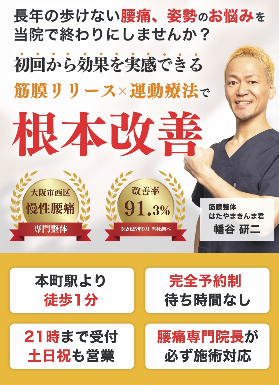 私は誰よりもあなたと向き合います。あなたの悩みを私に聞かせてください。あなたの慢性腰痛を改善するために全力で施術いたします。本気で慢性腰痛を改善したいと思われる方はいますぐご予約ください。