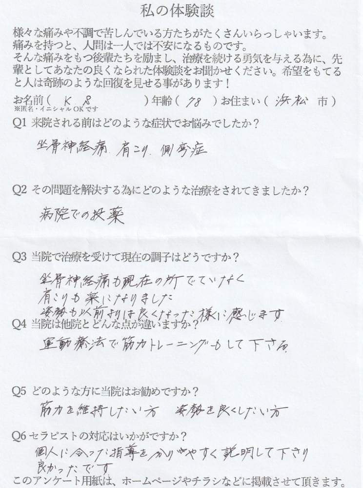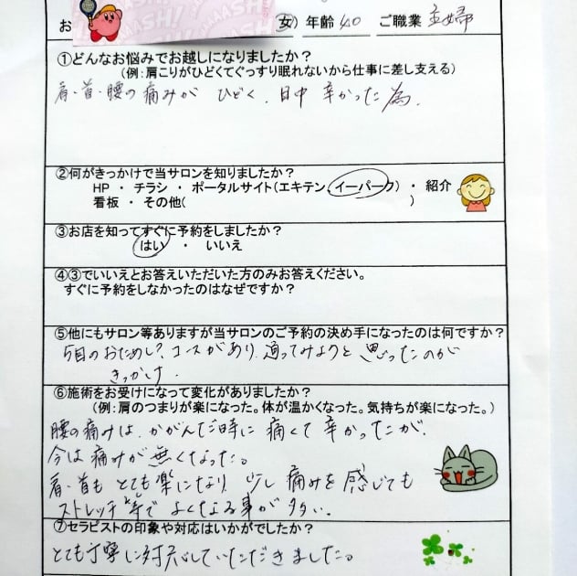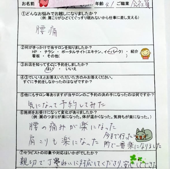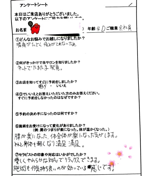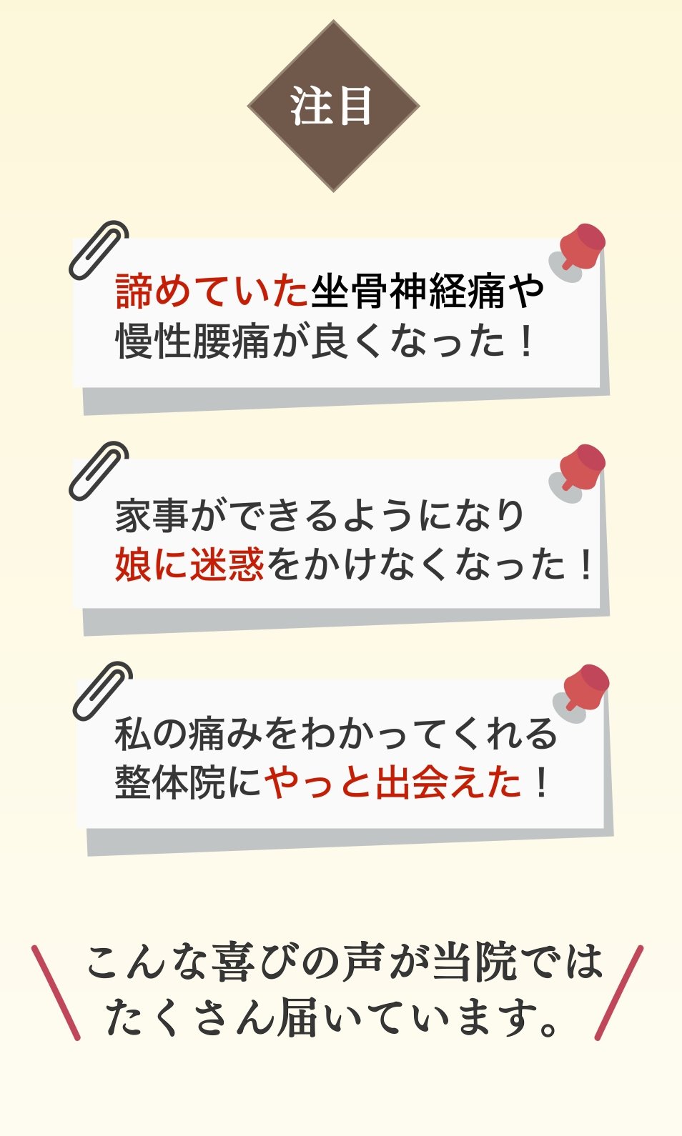 そして、痛みがあるところに行う電気やその場しのぎのマッサージではなく、痛みの根本原因をみつけて施術する整体法により皆様に喜びの声をいただいています。