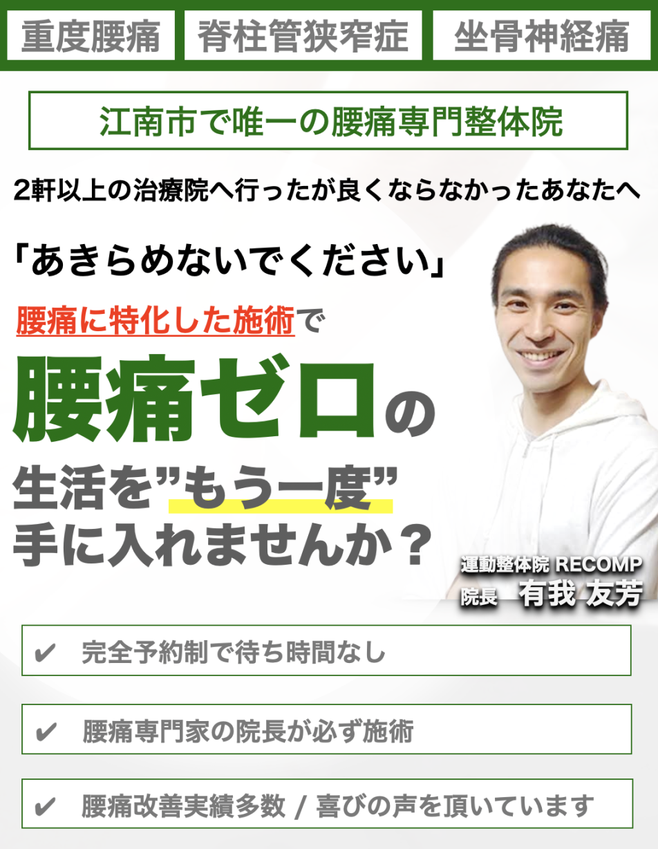 私は誰よりもあなたと向き合います。あなたの悩みを私に聞かせてください。あなたの慢性腰痛を改善するために全力で施術いたします。本気で慢性腰痛を改善したいと思われる方はいますぐお電話ください。